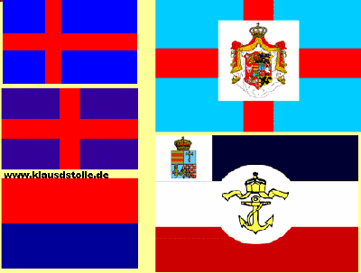 Ein rotes skandinavisches Kreuz auf blauen Grund (links oben) so sah die von 1774 bis 1919 verwendete oldenburgische Landesfahne aus, rechts daneben ist die von 1871 bis 1918 verwendete Landesdienstflagge mit der herzoglichen Standarte zu sehen, rechts darunter die Seedienstflagge des Großherzogtums Oldenburg. Die Flagge links in der Mitte wurde von 1774 bis 1871 als Staats-flagge verwendet, das Kreuz befindet sich hier direkt in der Mitte, diese Fahne war dann von 1919 bis 1935 Landesfahne des Freistaates Oldenburg und wurde seit 1952 neben der Landesflagge von Niedersachsen vor lokalen und regionalen Behörden in Bereich des Nds Verwaltungsbezirkes Oldenburg gehisst, heute sieht man sie an öffentlichen Gebäuden aber nicht mehr. Wahlweise wurde und wird aber auch die Fahnelinks untenmit den Oldenburger Landesfarben rot und blau bei regionalen Veranstaltungen verwendet.