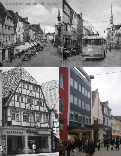 Heute steht an dieser Stelle ein eher langweiliges modernes Geschäftshaus. Der Durchgang im Erdgeschoss führt zum dahinter liegenden Herbartgang. Obwohl ich bereits als Kind diesen Gang häufig benutzte, da am damaligen Ende eine italienische Eisbude stand und es dort das besten Eis gab, das ich jemals gegessen habe, damals kam mir nicht in den Sinn, das ich dem vermissten Haus so nah war. Als mein Onkel das untere Foto vermutlich um 1990 aufnahm, wurde das Gebäude noch vom Textilhaus Hettlage mitbenutzt. Und man hatte den Eingangsbereich künstlerisch neu gestaltet, auf einer Säule ist auf Bronzeplatten unter anderen auch das alte Fachwerkgebäude dargestellt. Das von der OLB benutzte benachbarte Walmdachgebäude ist vor einigen Jahren durch einen Neubau der der Altstadtbebauung angepasst ist ersetzt worden.