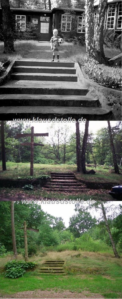 Wo heute nur noch eine steinerne Treppe zu sehen ist (Bilder Mitte 1995 und unten 2005), die auf einen grünen verwilderten Hügel führt, der von einem rund umlaufenden Sockel begrenzt wird, stand einmal das Hauptgebäude der Jugendherberge Birkenheide. Das obere Bild aus den 60er Jahren mit Karsten dem ersten Enkel der Herbergseltern entstand an der gleichen Stelle und zeigen den Mitteltrakt des Gebäudes in dem sich einst die Anmeldung und seit 1958 die Wohnung der Herbergseltern befanden. Heute erinnert auf dem von Pfandfindern genutzten Gelände nur noch das als Pfadfinderheim genutzte „Hexenhaus“ an die alte Zeit. In diesem bereits 1890 erbauten Haus wohnten bis 1957 die Herbergseltern, ab 1958 waren dort Schlafräume untergebracht.