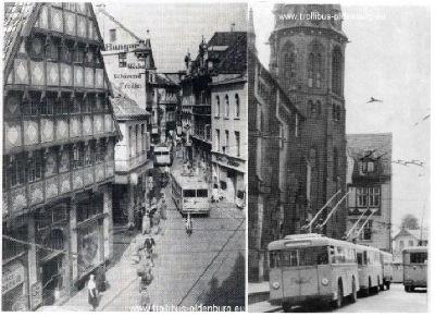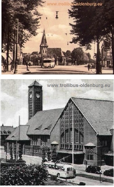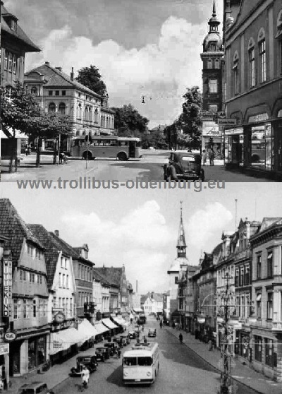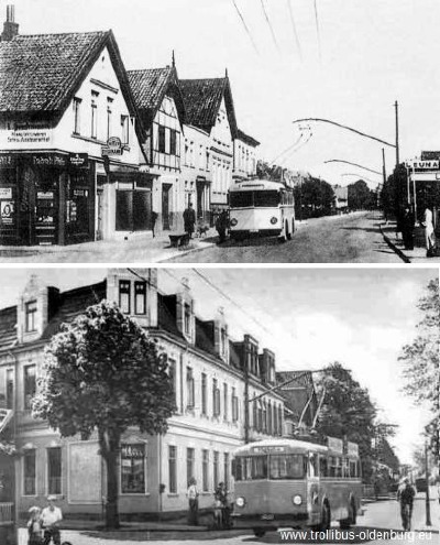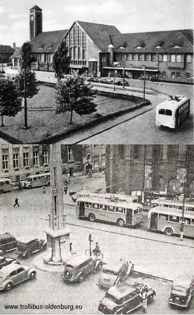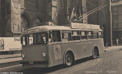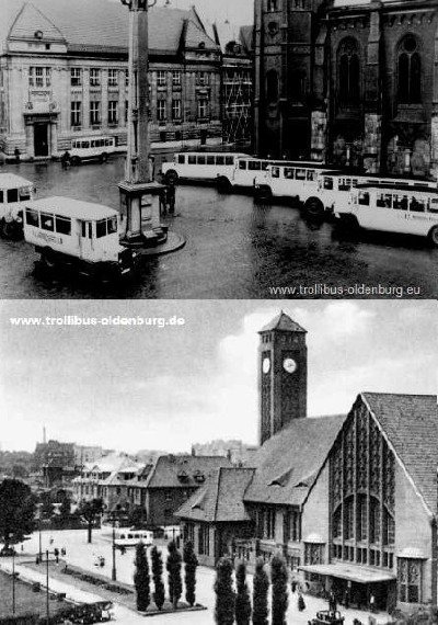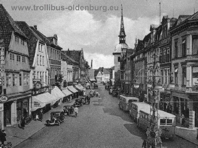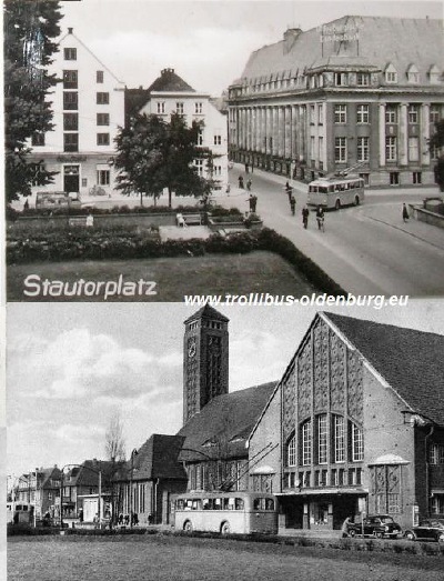 Der Obus hatte in Deutschland keine gesicherte Zukunft. Da die National-sozialisten die Errichtung von Trolleybusbetrieben förderten (Grund : Einsparung von Kraftstoff und Stahl, Nutzung heimischer Energie; Strom aus Kohle oder Torf), entstanden in Deutschland bis 1945 27 Betriebe. Nach dem Krieg kamen 25 Unternehmen bis 1949 hinzu. Der Ausbau ging noch weiter. Als Blütezeit kann man die Jahre 1954 / 1955 sehen, in denen in 67 deutschen Städten (Ost und West) der Obus fuhr. Obwohl der Oberleitungsbus eine bessere Beschleunig-ung aufweist, abgasfrei und leiser als ein Dieselbus ist, wurde das System nach 1960vielerorts ohne nennenswerten Protest zugunsten von vom Fahrdraht unabhängig einsetzbaren Dieselbussen aufgegeben. In der Vorkriegszeit war man offensichtlich stolz auf die neue technische Errungenschaft den Trollibus. Er wurde auf zahlreichen Ansichtskarten der Stadt Oldenburg mit abgebildet. Zum Beispiel mit dem auf den unteren Bild zu sehenden Trollibus an der Schlosswache.