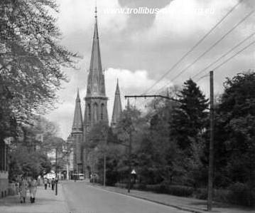 Der Trollibus OI-49101 in Richtung Flughafen vor der Lambertikirche um 1937. Im 2. Seitenfenster befand sich noch das Hinweisschild "Alexanderheide". (Foto 1 Bildarchiv Stolle)