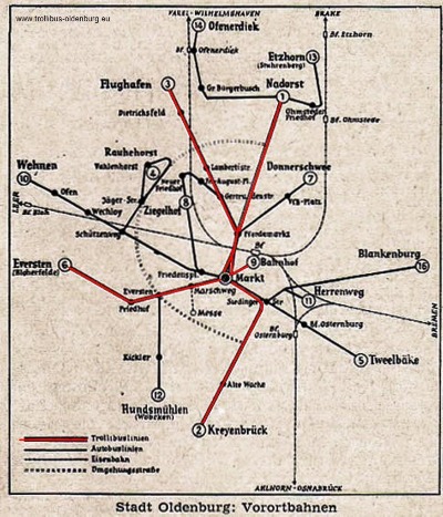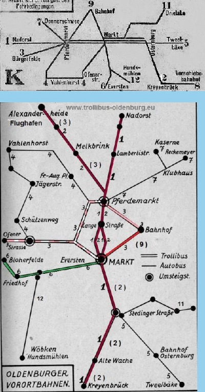 Der oben abgebildete Fahrplan wurde in dem 1951 erschienen Oldenburger Wanderbuch veröffentlicht. Abgebildet sind die Trollibuslinien (rot makiert), Autobuslinien, Eisenbahn und Umgehungsstraße. Die Linie 9 Markt – Bahnhof ist hier noch als Autobuslinie ausgewiesen. Nach Wiederherstellung (April 1951) der beim Bombenangriff auf das Bahnhofsviertel am 21.April 1945 zerstörten Oberleitungen wurde die Strecke ab 02.05.1951 wieder von Trollibussen befahren. (Archiv Stolle)
